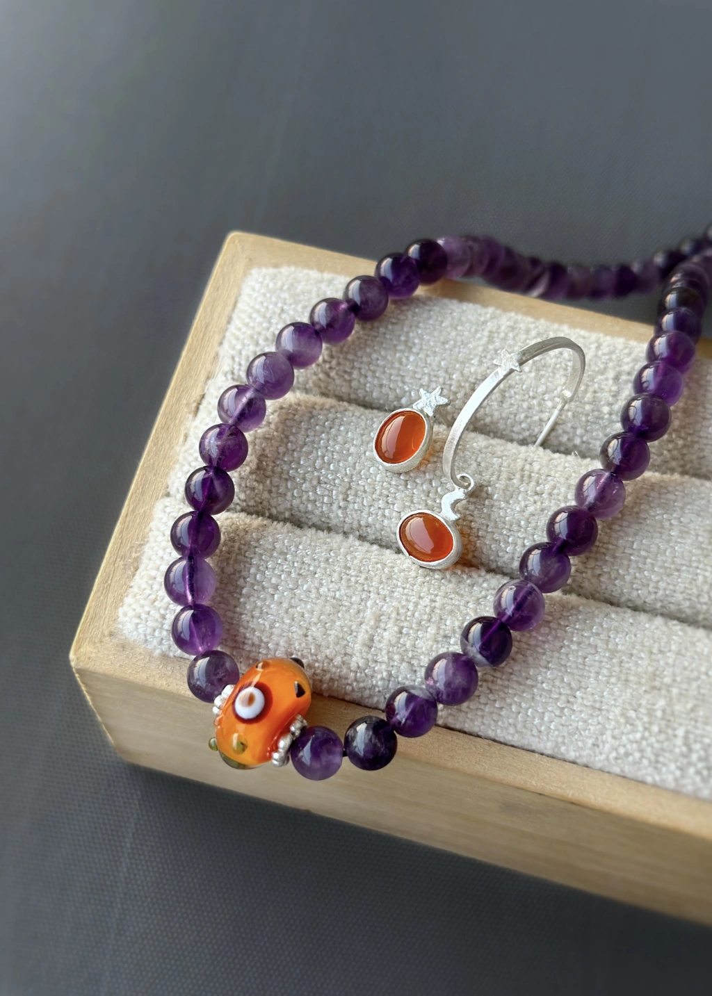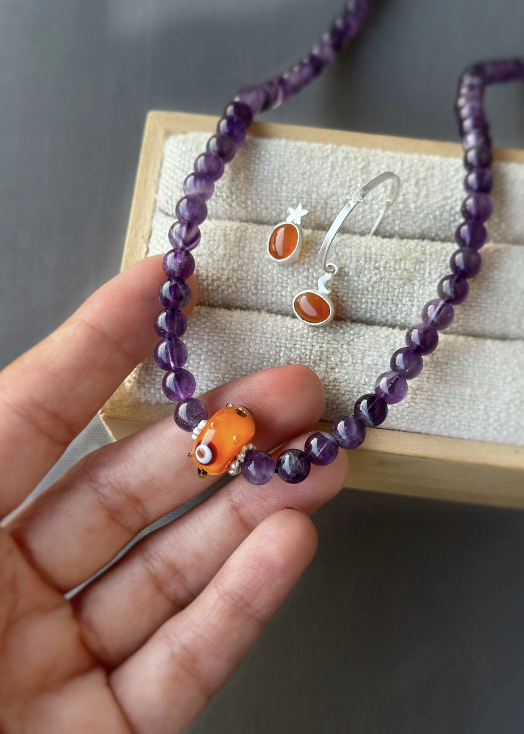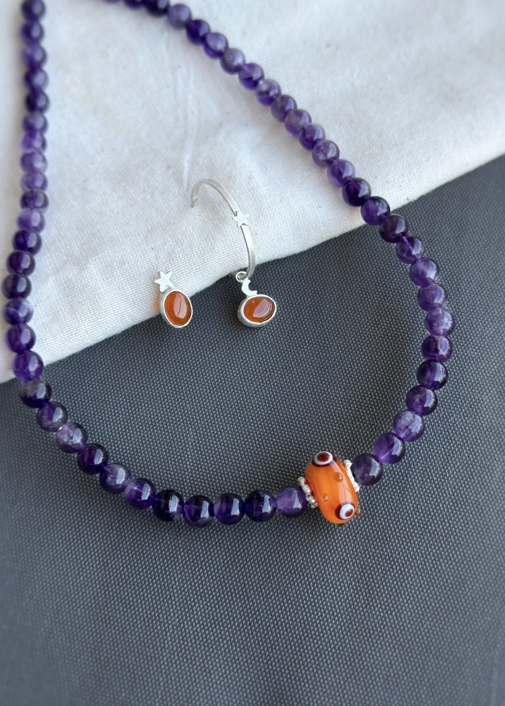 Kolye ucu el yapımı turuncu murano nazar boncugudur. Kenarlarında gümüş toplu el yapımı detaylar mevcuttur. Dizi kısmı mor ametist taşlardandır.