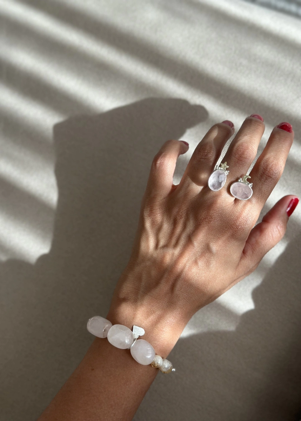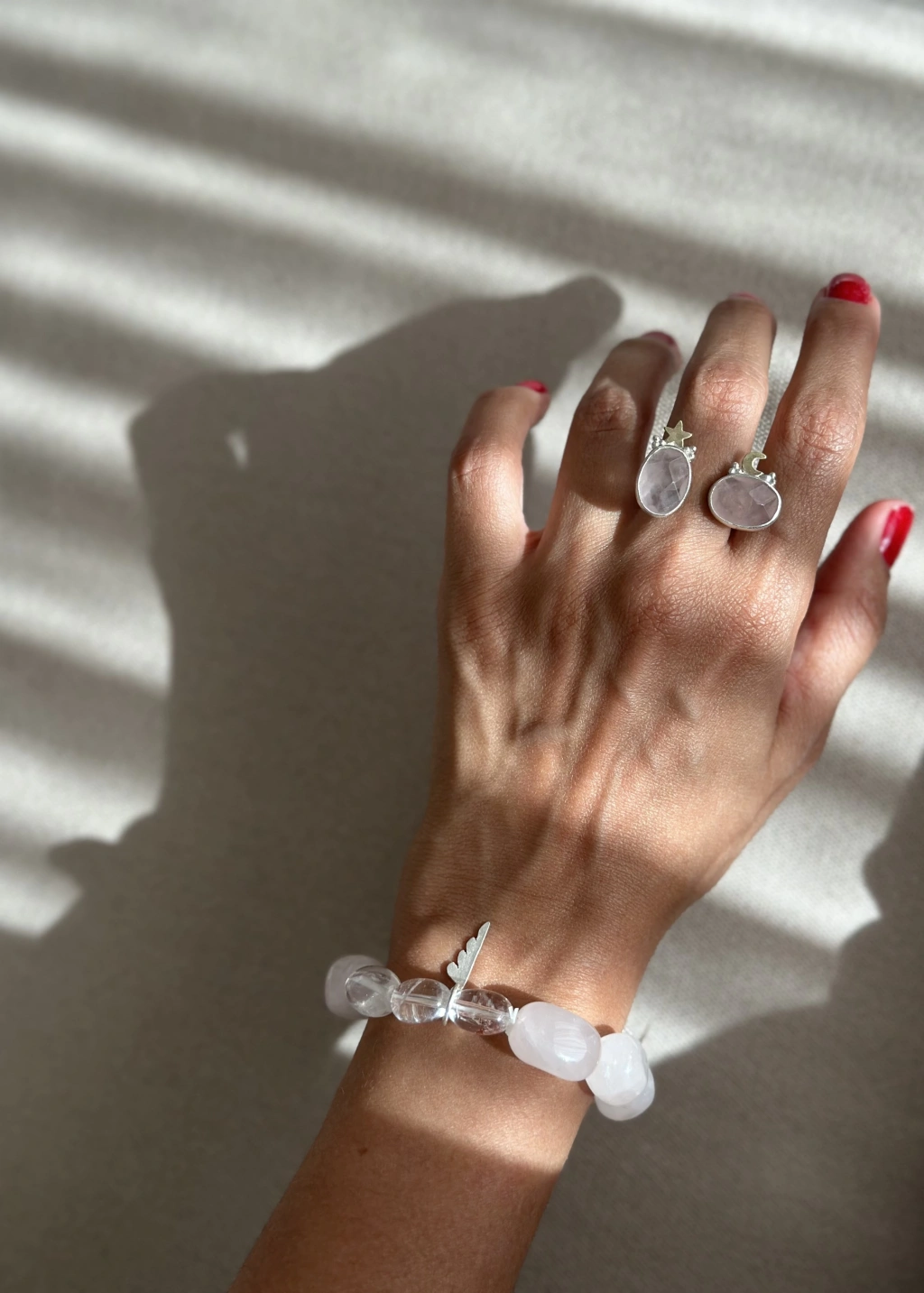 Pembe kuvars taş aşk taşı olarak anılmaktadır, aralarına gümüşten kalp figürü yapılmıştır.