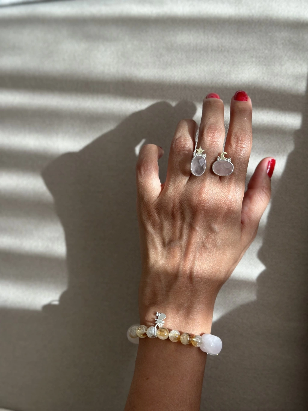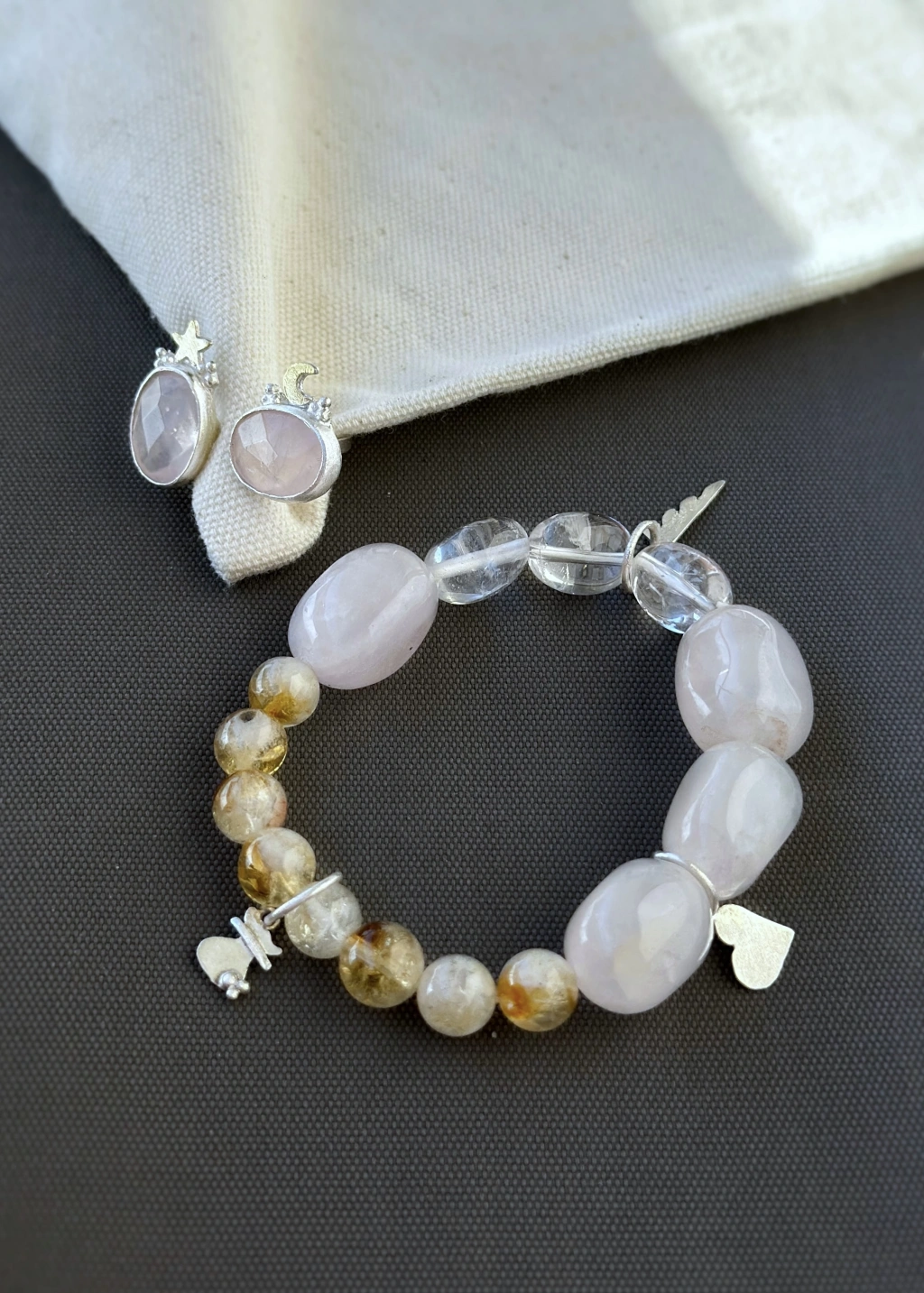 Sitrin taş, kristal kuvars ve pembe kuvars taşlarından yapılmıştır. Esnek misina kullanılmıştır, ölçüsü standarttır. Özel bir ölçü olacaksa sipariş notunda belirtilmeldir.