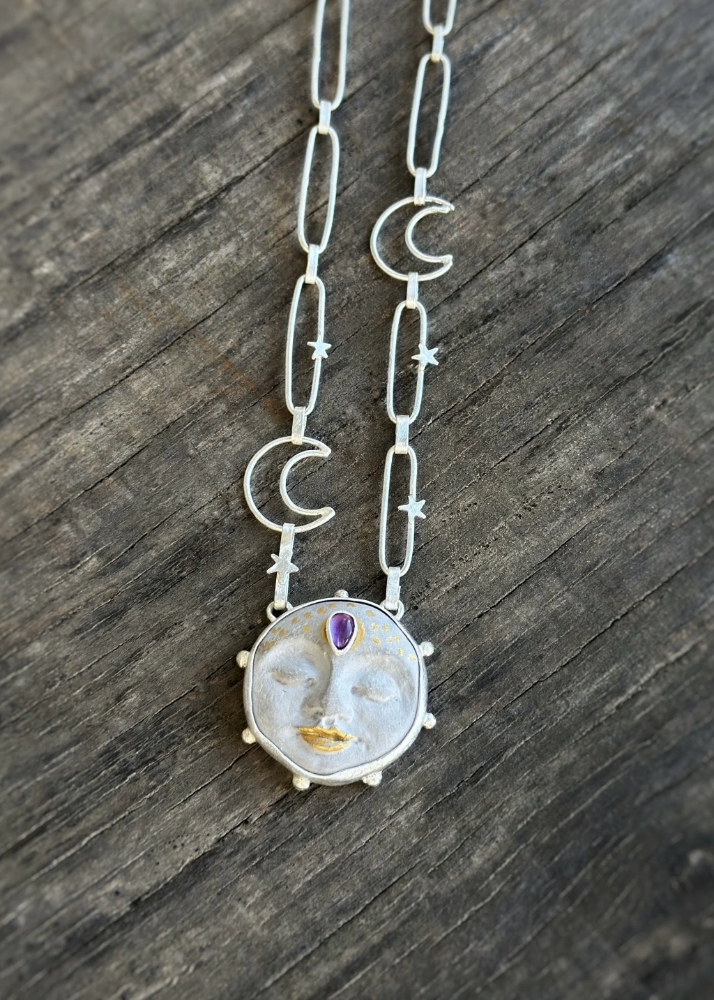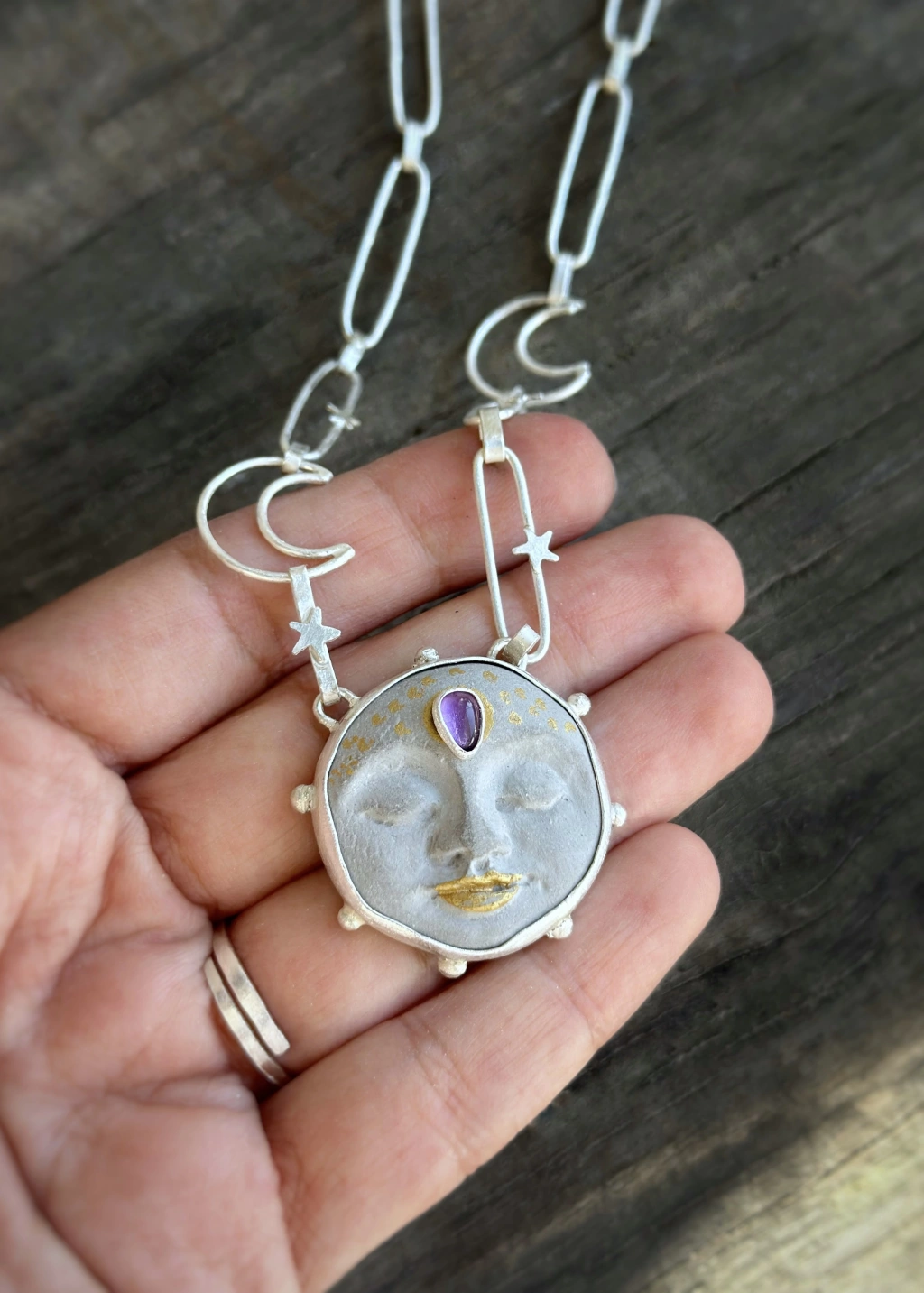 Kolyeucu el yapımu seramiktir, üzerinde ametist taşı eklemiştir. Kolye tamamen el yapımı ve gümüştür.
