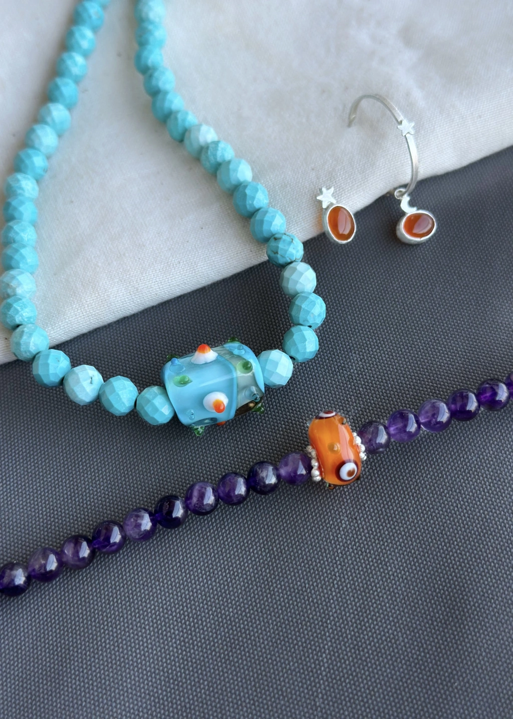Kolyeucu el yapımı nazar murano boncuktur, dizi kısmı turkuaz taşlardandır.